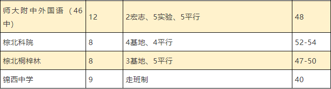 6 基地班 基地班顾名思义指的就是为学校培养好的学生的基地,基地班主要是成绩好的孩子,大部分是择校的时候学校承诺进入基地班的,有的是入学考试凭成绩分班进入的,基地班大多数存在于公立学校。代表学校 棕北中学:棕北中学的基地班则是固定的,进入要凭孩子的实力说话石室联中:石室联中的基地班曾以数学竞赛证书作为门槛来招收学生,初中走竞赛为主,现在竞赛取消,就以摸底考试为参考依据。49中:据说49中往年基地班有单独的考试,也会根据调考成绩选拔。
