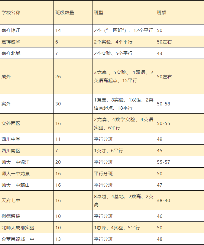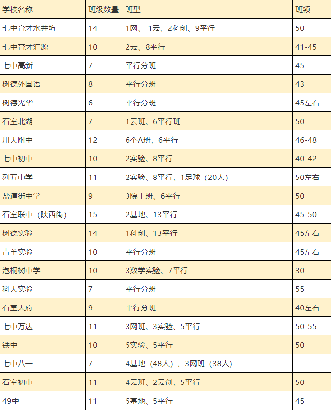 2019年成都各校的分班情况,看以下表格(信息不全,仅做参考)—— 私立分班情况