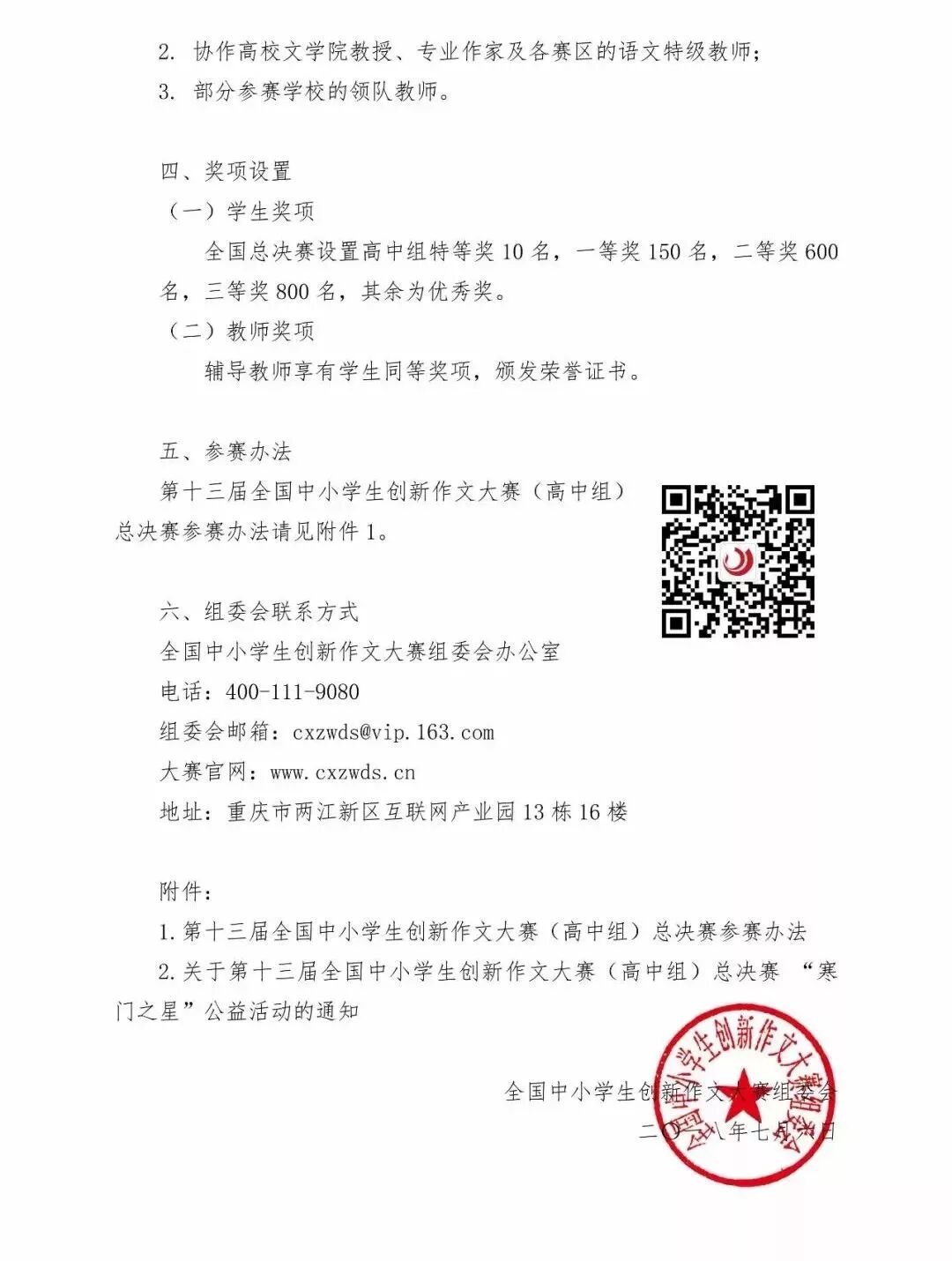 7月6日,2018年第13届中小学生创新作文大赛总决赛通知发布,总决赛于8月5日-6日在北京举行。总决赛共计1660人,获奖率高达50%。
